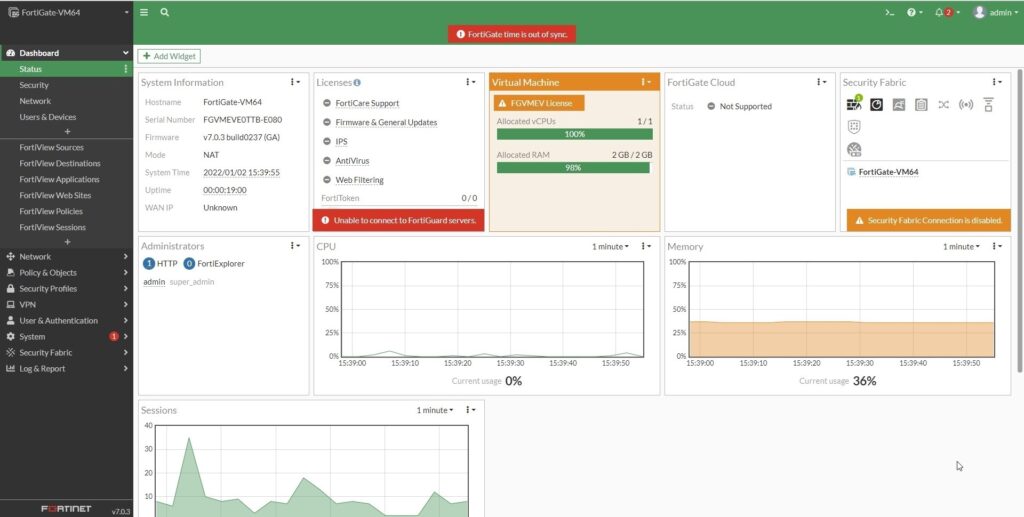 Başarılı girişten sonra FortiGate web arayüzü açılır ve cihaz yönetilmeye hazır hale gelir.