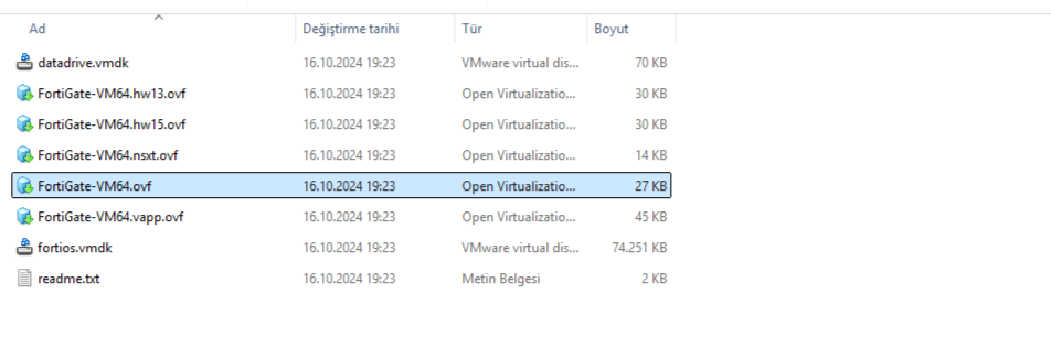 FortiGate-VM64.ovfdosyasını göreceksiniz.