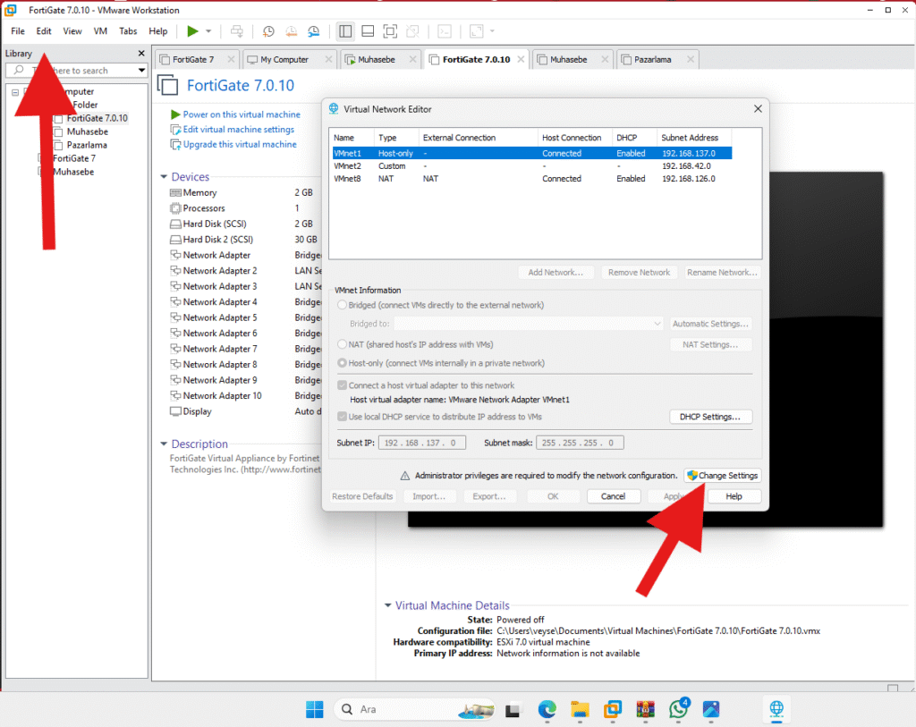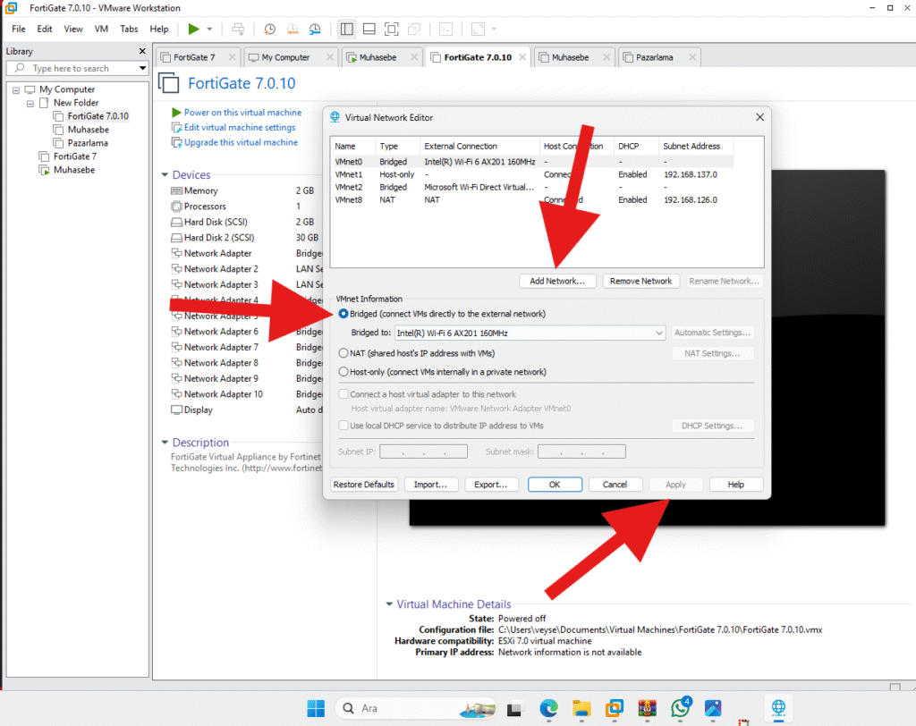 Bu adımda FortiGate sanal makinesine birden fazla network adapter ekleyerek, cihazlarımızın farklı ağlarda (departman bazlı) çalışmasını sağlıyoruz.