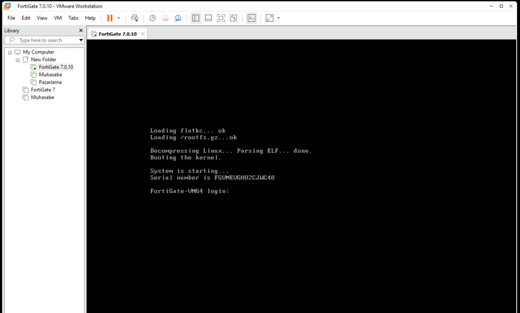 Bu adımda FortiGate sanal makinesini ilk kez çalıştırarak, arayüze erişim öncesi gerekli temel işlemleri yapıyoruz.